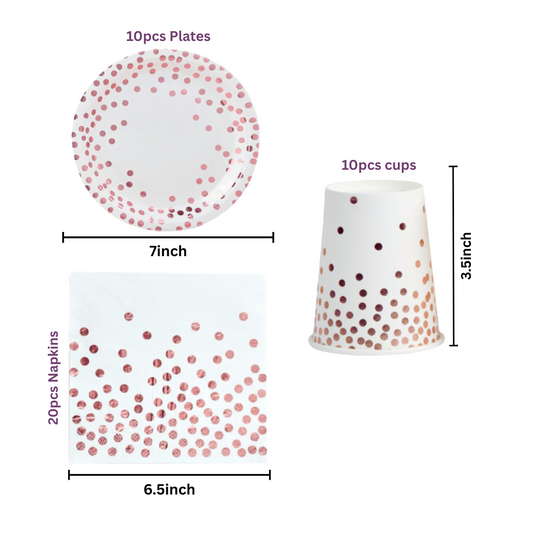 White and Rose gold Polka dot Dinnerware, Plates, cups, Napkins