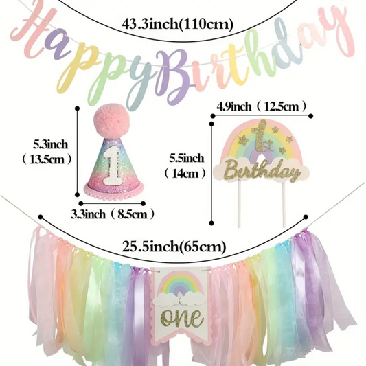 4pcs Macaron Colorful Rainbow One First Birthday Decoration with Highchair banner and Hat